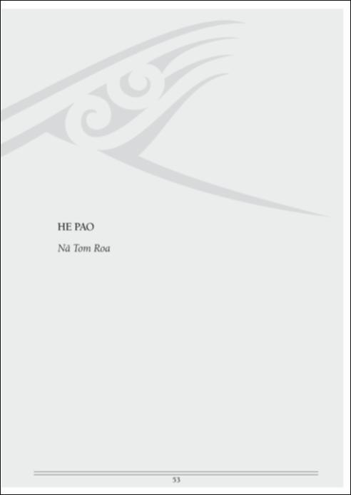Item type: Item , Te Kōtihitihi: Ngā Tuhinga Reo Māori, Putanga 2(The University of Waikato, 2012-05) Ngāpō, Korohere; Manuirirangi, Hōri; Murphy, Ēnoka; Tuaupiki, JackieKoinei te katoa o te Putanga 2 o te puka hautaka, Te Kōtihitihi.Item type: Item , He pao(The University of Waikato, 2012-05) Roa, TomKo Te Whare Wānanga O Waikato" te ingoa o tētehi pao nāku i tito hei waiata mā Te Whare Wānanga O Waikato, i te tau 2004.Item type: Item , He pūrongo whakahokinga kōrero a te akomanga rūmaki o Te Tohu Paetahi(The University of Waikato, 2012-05) Nock, SophieKo te whāinga matua o tēnei rangahau he whakakaokao, he wetewete āno hoki i ngā whakahokinga kōrero a te hunga uiui i kake atu ai ki runga i te waka o Te Tohu Paetahi i te tau 2008, i raro i te kōawa o Rehutai, i raro anō hoki i te maru o Te Whare Wānanga o Waikato. Ka aro atu ki ngā urupare a te hunga tekau mā ono mō te kaupapa nei o Te Tohu Paetahi, ka mutu, ka matapakihia ngā kōrero me ngā whakaaro o taua hunga kia āta kitea ai, āe rānei e tika ana te whakahaere, te mahi whakaako i te reo, te tautoko mai hoki a ngā kaiwhakaako me te kura. I te mutunga iho tautoko katoa te hunga uiui ki aua mea katoa.Item type: Item , Te kākahu whakataratara o Ngāi Tūhoe: Ko te reo ōkawa, ko te reo o te marae(The University of Waikato, 2012-05) McFarland, AgnesKo te reo ōkawa ara ko te reo o te marae, he reo hōhonu. Ka mutu, he tapu katoa ōna āhuatanga katoa. E rua ngā kōrero whakatau o runga i te marae. Ko te karanga me te whaikōrero. Kai roto i wēneki reo e rua, ka ahu mai te kupu nei te poroporoaki. Ka āta tirohia te poroporoaki i roto i ngā whakaaro e pā ana ki ngā tikanga o te karanga. Whai muri ka titiro ki te wāhanga o te poroporoaki i roto i te whaikōrero. Mā wēneki tikanga e rua, ka whakaputaina ngā whakaaro me te hōhonutanga o te mamae o te ngākau pōuri ka ea hoki te mamae. Ka tiro ake tātau ki ngā take i whakaputaina, ngā tohutohu ā rātau mā me ngā rongo o te wairua o te kupu kōrero. Tae atu hoki ki te tohungatanga ki te whakatakoto i te rerenga kupu mai i ngā whatumanawa o ngā kuia me ngā kaumātua ō Ngāi Tūhoe. Nō reira, ka titiro ake tātau ki ngā momo āhuatanga katoa o te karanga. Whai muri ko ngā tikanga e pā ana ki te whaikōrero. Whai muri, ko wētahi atu tūmomo tauira mō te poroporoaki.Item type: Item , Me tangi ki te hunga whakamomori?(The University of Waikato, 2012-05) Roa, RaukuraI runga o Tūrangawaewae Marae i te 19 Akuhata, 2011 i te rā kawe mate o te koroneihana o Kīngi Tuheitia, i whakatakotohia e Professor Pou Temara te urupounamu ‘ko te hunga whakamomori me tangi me aha rānei?’ Ko taku whakapae, ko te whakaaro pea o roto o tēnei pātai, e aro ana ki te hunga whakamomori. Heoi, ko te aronga kē pea o te kaupapa, ko tēnei mea te tangihanga. He whakapono nō te ao Māori, ko te tangihanga, he whakarangatira i te tūpāpaku me ngā mahi i oti i a ia i te wā o te ora. Heoi, ko tāku e uaparetia ana, ko te kawenga matua o te tangihanga, ko te aroha o te tangata ki te tangata. Ko ngā kaupapa o te tangihanga, tuatahi he tuku i te wairua ki te wāhi ngaro. Tuarua, he huarahi e tīngia ai e te Māori ngā panonitanga o te mate. Tuatoru, he hui e whai oranga ai te hunga ora. Nō reira ko taku paremata ki te pakirēhua a Professor Pou Temara, ae me tangi ki te hunga whakamomori ka tika. Ko te aronga o tēnei pepa he wānanga i ngā tuhituhinga kua puta kē ki te ao mā te wetewete i ngā kōrero mō te tangihanga, te mate, te rerenga o te wairua, te whakahaeretanga o te tangihanga, te whakamomori, me ngā whakapono o iwi kē mō te whakamomori.Item type: Item , Te Ahi Kā(The University of Waikato, 2012-05) Temara, PouKo te urutaumatua o tēnei tuhinga, ko te matapaki i te ahi kā. He aha tēnei tikanga? I pēhea i ara ake ai? He aha ōna mātāpono, ōna taipitopito? Koia te tūāpapa mō te tuhinga nei. Tuarua, ko te wānanga i te tikanga Māori me ōna rerenga pērā i te whakapapa. Ko te pātai ka puta i tēnei wāhanga o te wānanga ko tēnei nā, he aha te wāhi o te whakapapa ki te ahi kā? Ko te ngako o tēnei tuhinga ko te wetewete i te tikanga ahi kā kia whai tikanga ai te whakataukī nei, ‘ko te ahi kā te mana o te hapū ki te whenua’.Item type: Item , Kia reo Māori anahe te reo karanga(The University of Waikato, 2012-05) Puke, HaupaiMā taku karanga o runga ake nei tēnei tuhinga e wāwāhi. Ahakoa he aha te ahurea ōna tikanga me ōna kawa, kua hurihia i roto i ngā rautau. Ko ngētehi kei te pupuruhia tonutia hāunga anō he hou ōna āhuatanga. Ko te kaupapa rangahau o tēnei tuhinga ko te karanga me ngētehi āhuatanga ōna hei tautoko i te whakahau kia noho reo Māori anahe te reo karanga. He aha e pēnei na ai te whakaaro mō tēnei o ngā tikanga o te ao Māori? I runga anō i ngā āhuatanga hou, i ngā whakarerekētanga tikanga o te karanga i roto i tēnei ao hurihuri kāore e tautāwhina te take. Ko ngā kōrero, ngā whakaaro hoki e whai ake nei e wānangahia ai hei tautoko i tēnei whakapae āku.Item type: Item , He Maimai Aroha mō Nātana Waka Takurua(The University of Waikato, 2012-05) Manuirirangi, HōriHe kupu whakamānawa nā Hōri Manuirirangi ki a Nātana Waka Takurua i tana matenga.Item type: Item , He Poroporoaki ki a Kahurangi Te Heikōkō Kāterina Mataira(The University of Waikato, 2012-05) Temara, PouHe kupu whakamānawa nā Ahorangi Pou Temara ki a Kahurangi Te Heikōkō Kāterina Mataira i tana matenga.
