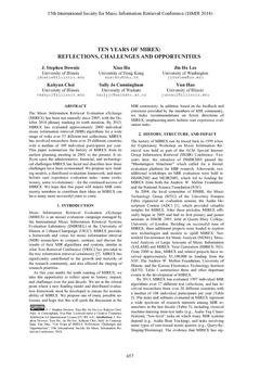 Downie, J. S., Hu, X., Lee, J. H., Choi, K., Cunningham, S. J., & Hao, Y. (2014). Ten years of MIREX: reflections, challenges and opportunities. In Fifteenth International Society for Music Information Retrieval Conference, Taipei, Taiwan: ISMIR. (pp. 657–662).