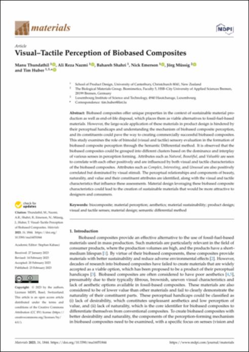 Thundathil, M., Nazmi, A. R., Shahri, B., Emerson, N., Müssig, J., & Huber, T. (2023). Visual–tactile perception of biobased composites. Materials, 16(5), 1844. https://doi.org/10.3390/ma16051844