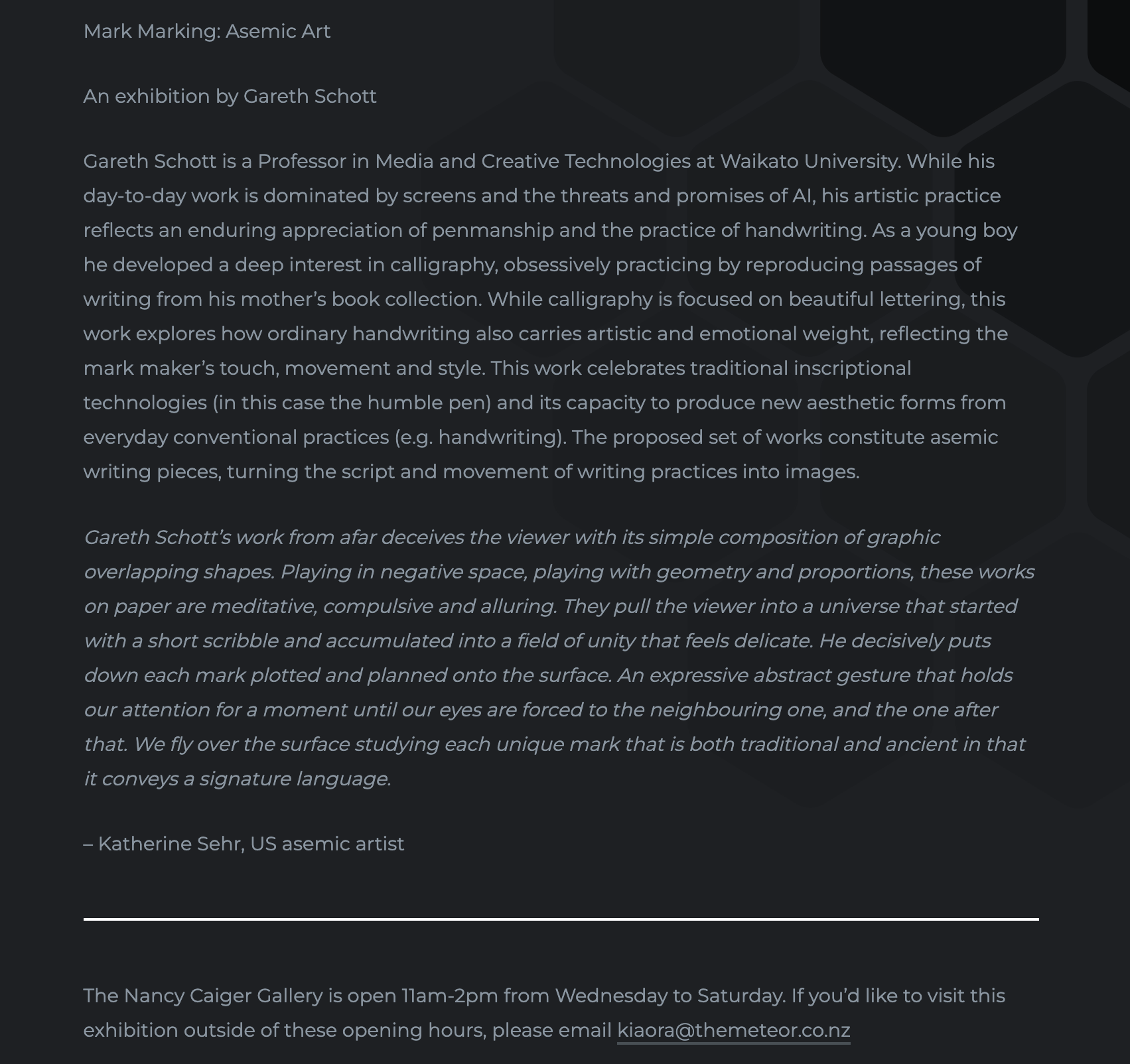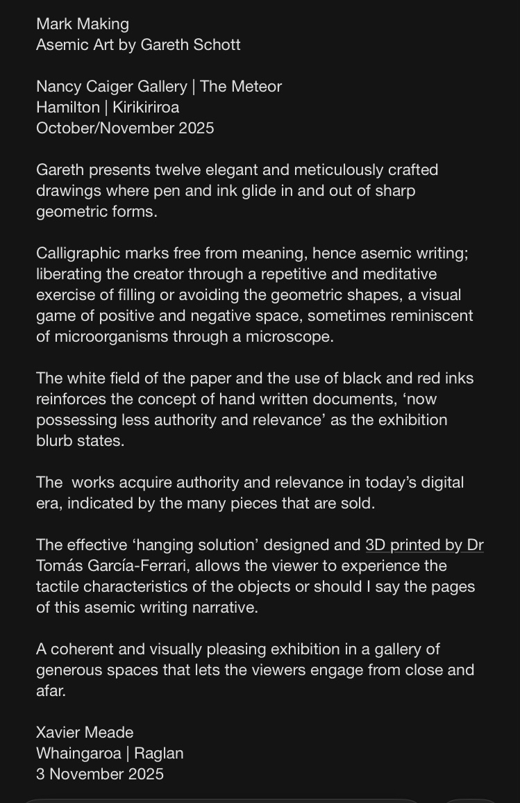 They belong to the practice of 'asemic writing art’ – asemic referring to the lack of specific semantic content or meaning. As an artistic style, asemic works celebrate unhindered explorations of handwriting.